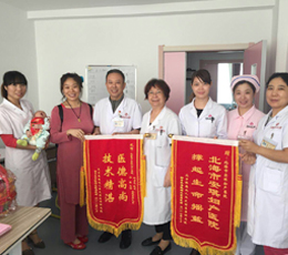 产妇家属靳先生,于2016年12月8日,将一面锦旗送给予产科于喜峰主任和麻醉科李建华及全体医护人员,感谢他们在院期间的关照。锦旗上“医术精湛品德优·服务热情如亲人”两句话,字字透露出产妇对医护人员的感激之情。
